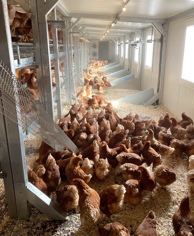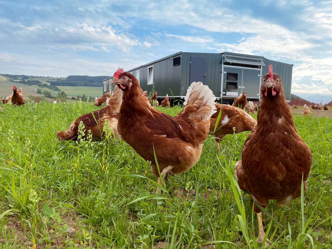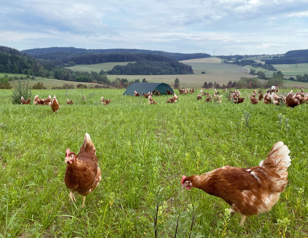 Všechny naše slepice jsou plemene Lohmann Brown nebo Bowans Brown, snášejí tedy vejce hnědé barvy. Kuřátka jsou odchovávána ve stejném typu technologie, aby pro ně byl přechod do nového prostředí plynulý. V kleci tedy za svého života nestráví ani minutu! Do mobilního kurníku se stěhují ve věku 18 týdnů.