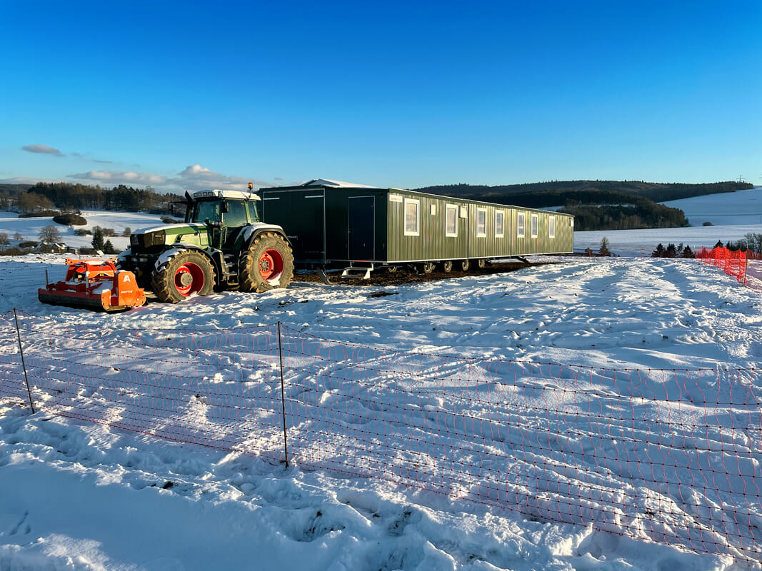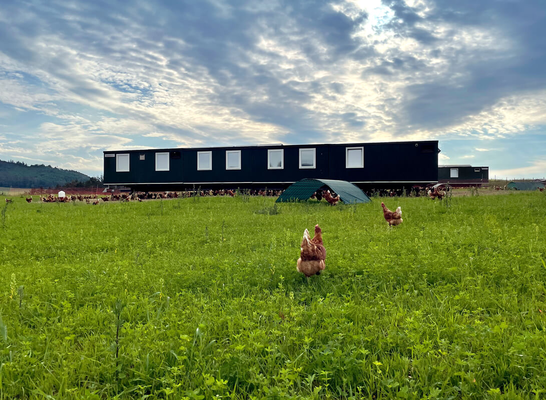 V nádherné přírodě údolí říčky Kocáby, kousek od středočeského městečka Nový Knín, najdete louky s našimi dvěma mobilními kurníky Farmermobil fm1300. Žije v nich přes čtyři tisíce nosnic, které mají k dispozici spoustu prostoru k pasení na trávě i k hrabání.